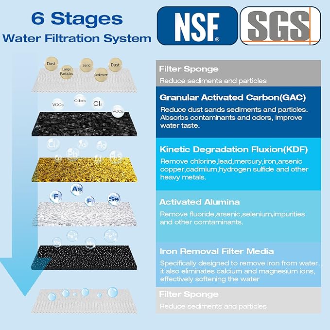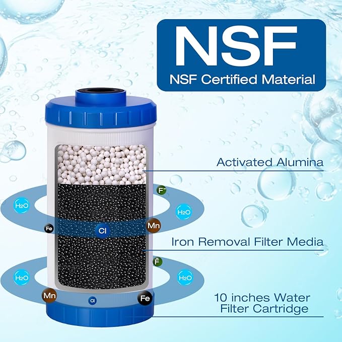 - Iron Filtration Media:The first filter cartridge is packed with Iron & Manganese Reduction Media and Activated Alumina, effectively removing iron, fluoride, and manganese from your water. The second cartridge contains KDF 58 and GAC, which eliminate chlorine, heavy metals, and odors while improving taste. This 10" x 4.5" whole house water filtration system provides up to 70,000 gallons of clean water. For optimal performance, we recommend replacing the filters every 3-6 months to ensure consistent water quality for your home.