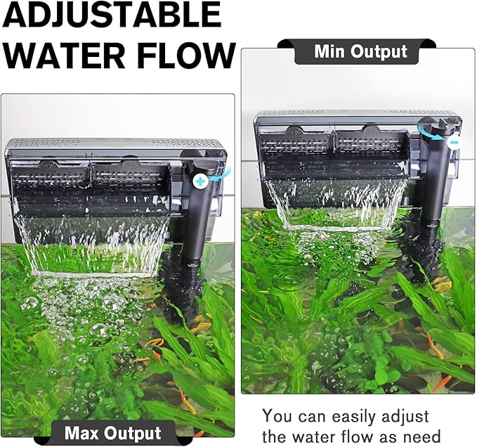 - Adjustable to Meet Your Needs: The water flow speed can be adjusted through the top knob, max flow rate is 315 GPH. The intake tube can extend flexibly, adjust the length according to the depth of the tank. The water inlet is also with sponge to prevent small fish or shrimp from getting suck in