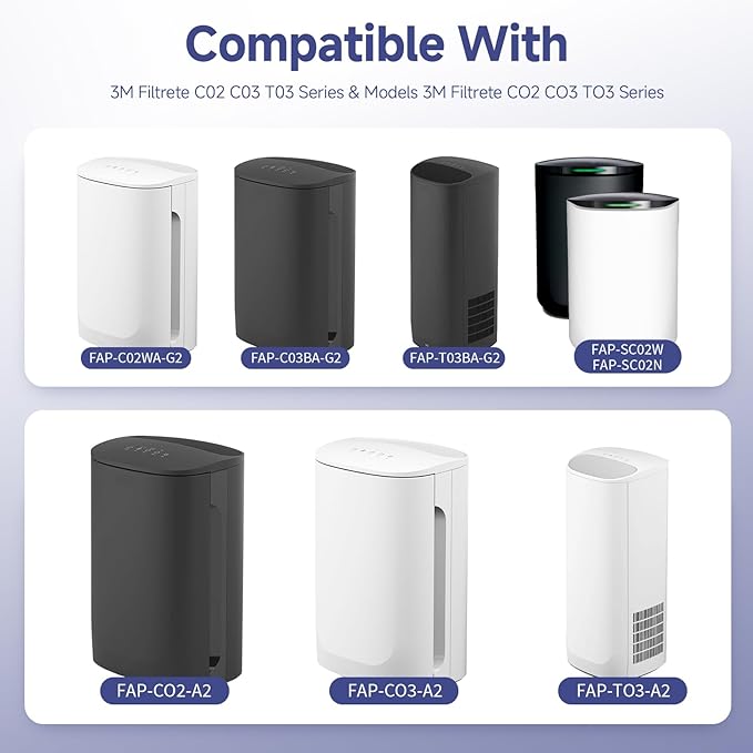 - Compatible models: Designed specifically for use with 3M Filtrete room purifiers FAP-C02WA-G2, FAP-C03BA-G2, FP-T03BA-G2, FAP-SCO2N, FAP-CO2-A2, FAP-CO3-A2, and FAP-TO3-A2 models. Make sure to check your unit model before placing an order to ensure compatibility