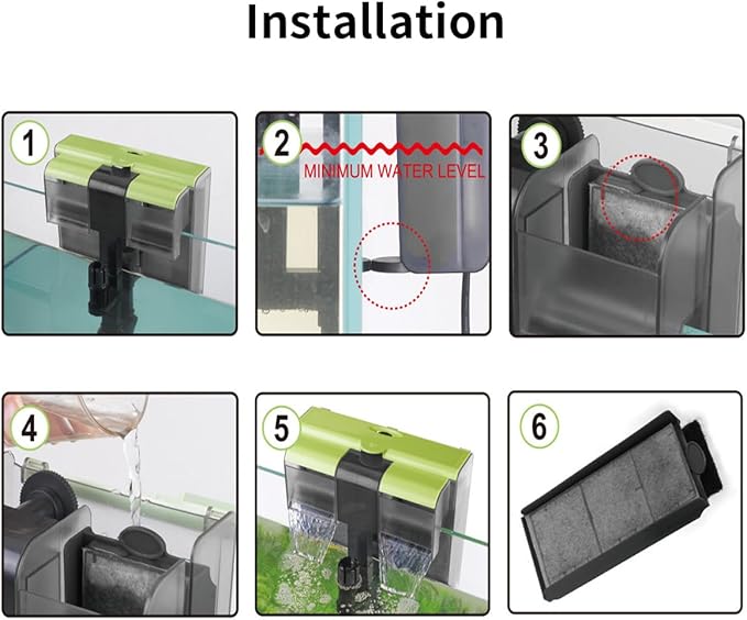 - ✨ Easy and Quick Installation: Easily hang it on your aquarium, suitable for glass thicknesses less than 0.7”. For first-time use, fill the filter with water before powering it on to start the filtration process effortlessly! Adjust the water level to be within 0-2cm of the drainage outlet to effectively reduce water flow noise, enhancing the serene ambiance of your aquarium