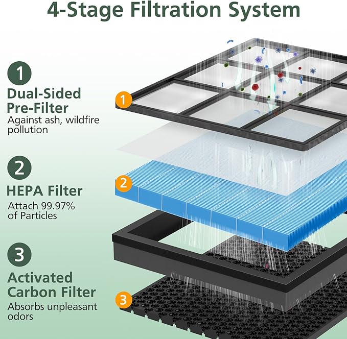 - 4-IN-1 FILTRATION - Our Vital 100S-P Smoke Remover replacement filter features 4-Stage Filtration System: ①②Dual-Sided Pre-Filter ③HEPA Filter ④Activated Carbon Filter. It's more effective against ash and pollution spread by wildfire smoke