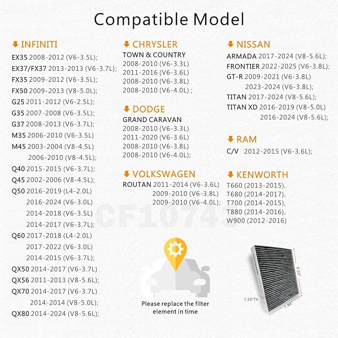- Cabin air filter is suitable for Compatible with Infiniti NISSAN ARMADA 2017-2024 (5.6L-V8); FRONTIER 2022-2025 (3.8L-V6); NISSAN GT-R 2009-2021 (3.8L-V6), GT-R 2023-2024 (3.8L-V6); NISSAN TITAN 2017-2024 (5.6L-V8), TITAN XD 2016-2019 (5.0L-V8), TITAN XD 2016-2024 (5.6L-V8); VOLKSWAGEN ROUTAN 2011-2014 (3.6L-V6); ROUTAN 2009-2010 (3.8L-V6), ROUTAN 2009-2010 (4.0L-V6); RAM CV 2012-2015 (3.6L-V6); CHRYSLER TOWN & COUNTRY 2008-2010 (3.3L-V6) & 2011-2016 (3.6L-V6) & 2008-2010 (3.8L-V6) & 2008-2010 (4.0L-V6); DODGE GRAND CARAVAN 2008-2010 (3.3L-V6), CARAVAN 2011-2020 (3.6L-V6), CARAVAN 2008-2010 (3.8L-V6), CARAVAN 2008-2010 (4.0L-V6);