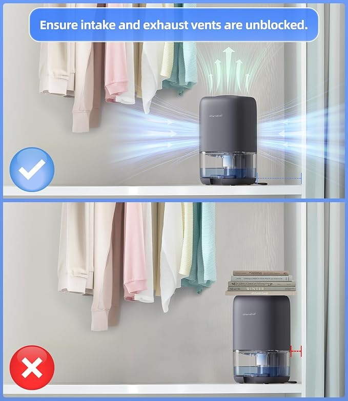 - Important usage tips: Please do not block the air inlet at the top of the dehumidifier and the air outlet at the back.