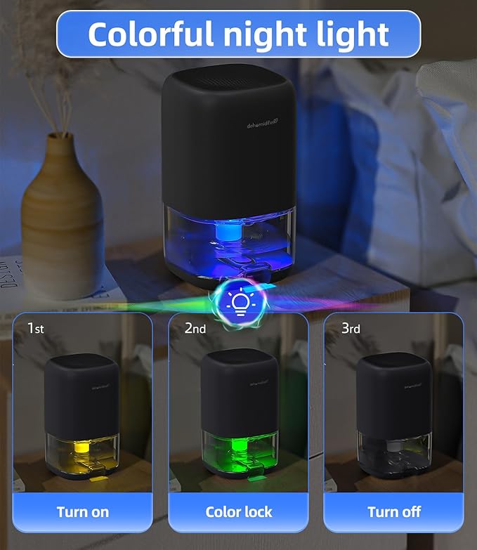 - Quiet Dehumidifiers with 7 Color Light: Simply press the light button and you can see 7-color romantic atmosphere lights, and the ultra-quiet operation(28 dB), perfect for office or sleeping environments.