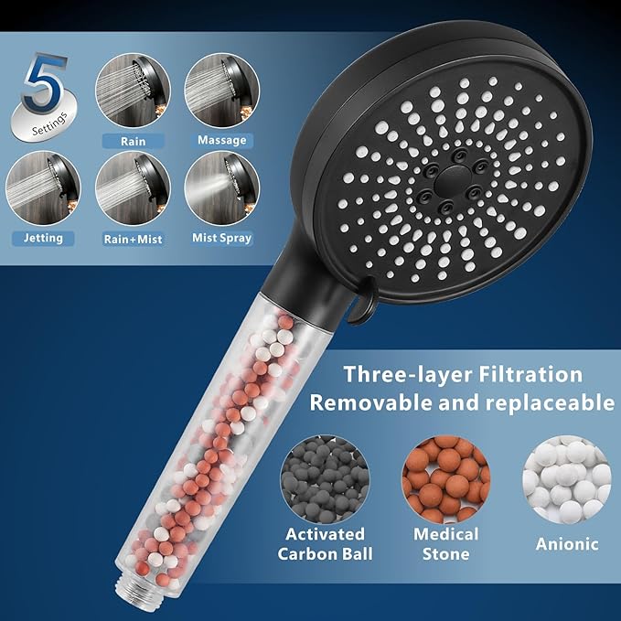 - HEALTH CARE SHOWER SYSTEM - Our high flow showerhead is made of food grade ABS material, Can filter soft water, Shower set includes: 6" round shower head, 5 spray hand held shower, 23 layer filter with cartridge, 59" hose, 3-way diverter, self-adhesive bracket, flow restrictor, Teflon tape.