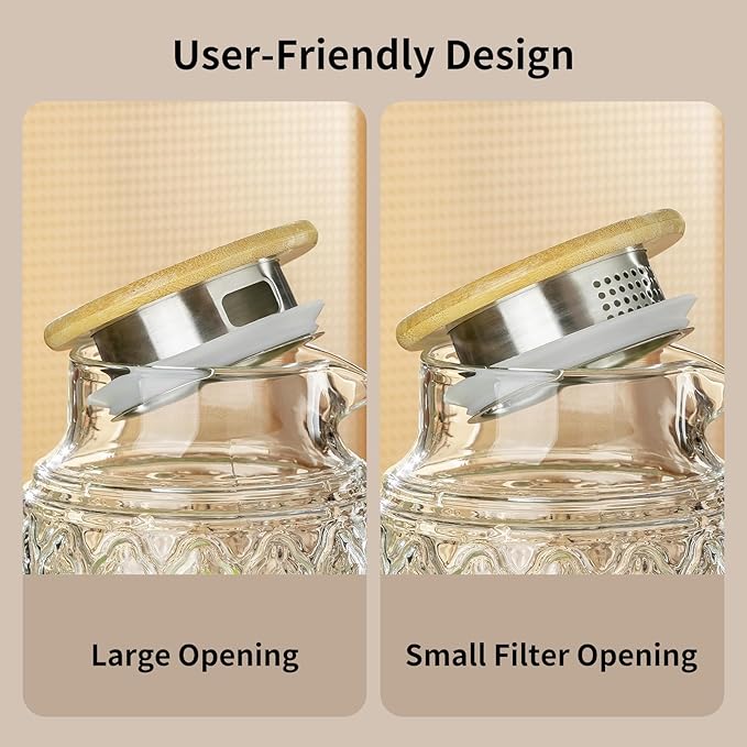 - 【BEAUTIFUL BAMBOO LID AND PRACTICAL HANDEL 】This bamboo lid has two openings, which can be turned to pour water or the other side to filter beverages. The soft silicone seal keeps the lid firmly on the lid to prevent leakage. Specially designed with an anon-dripping spout and ergonomically designed handle makes it easy to hold and pour.