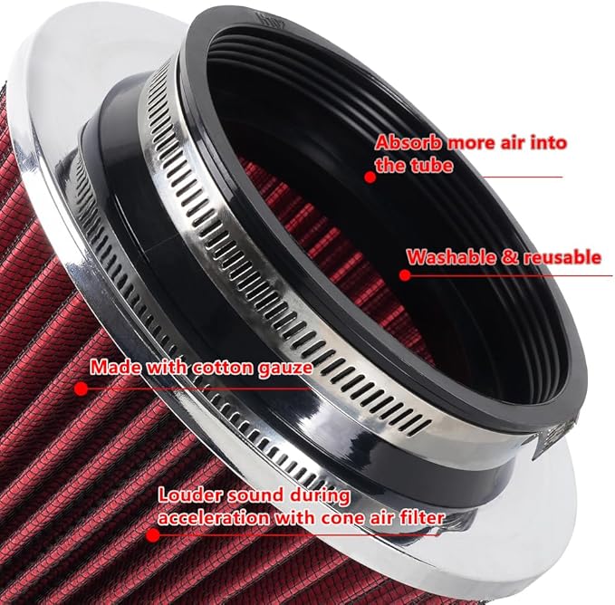 - INSTALL EASY- Cone Air Filter built with simple clamp-on design and 3 sizes. Easy to assemble with all parts included