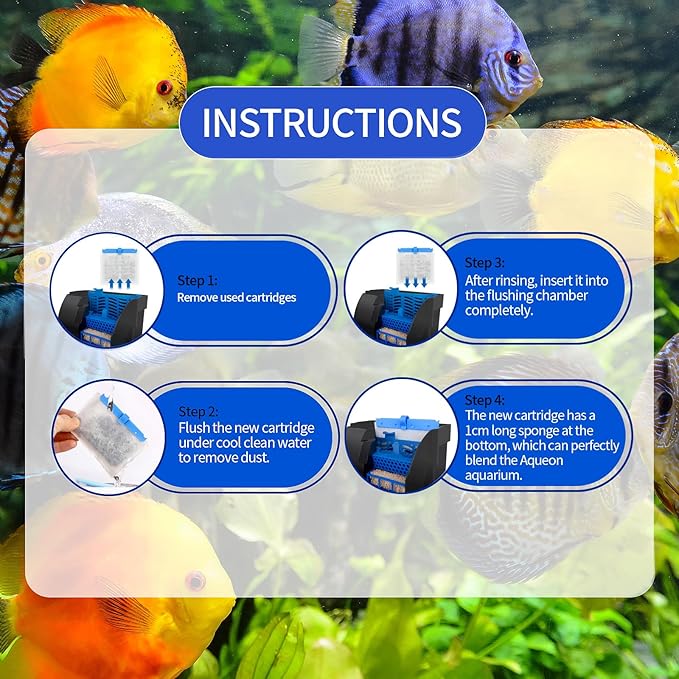 - 🐟【Easy to Installation】 Simply remove the old cartridge and replace it with a new one, insert the cartridge into the filter chamber. In addition, please make sure to rinse the cartridge before use to remove the dust from the transportation and packaging process.