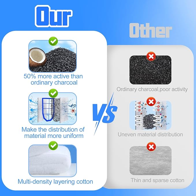 - UPGRADED 8-GRID DESIGN- Our filter cartridges with 8-grid frame,make the distribution of zeolite and carbon more uniform. Their dual dense-floss cotton+zeolite+carbon, forming 4 stages efficient filtration to remove odors and discoloration, keep your fish tank water crystal clear, polished and healthy.