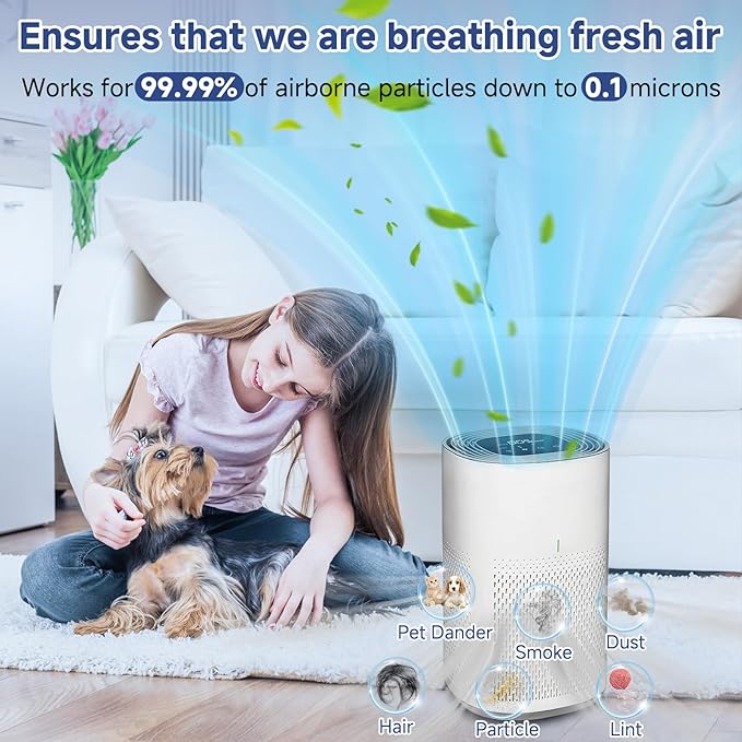 - H13 HEPA FILTER & ACTIVATED CARBON FILTER: Outer Pre Filter captures large particles, such as dust, lint, fibers, hair. H13 true Hepa filter reduces 99.99% of airborne particles down to 0.1 microns. Activated Carbon Filter assists in neutralizing household odors and fumes from pets, cooking, smoke, wildfire, chemical pollutants. Making your family breathe safer under a cleaner and fresher air.
