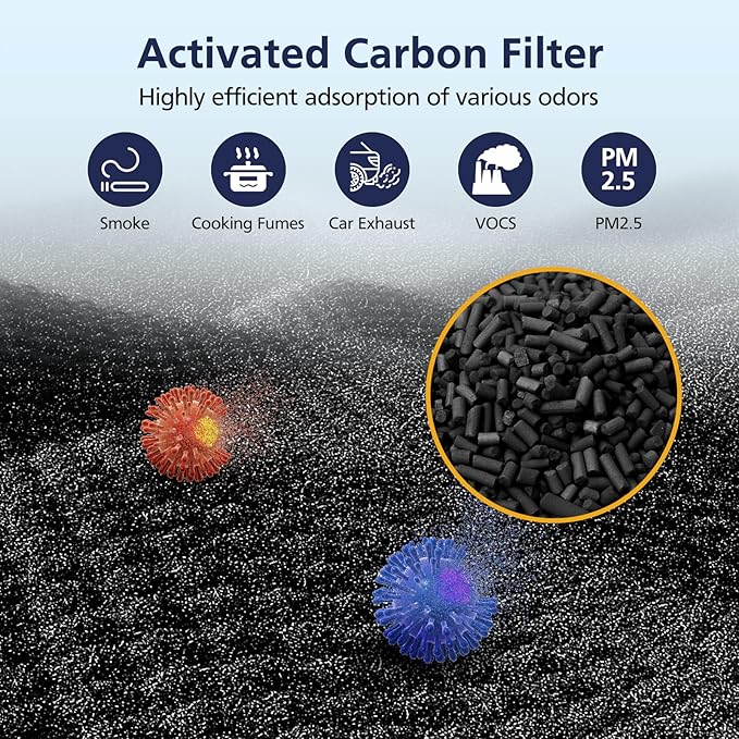 - ใ๐๐๐ญ๐ข๐ฏ๐๐ญ๐๐ ๐๐๐ซ๐๐จ๐ง ๐ ๐ข๐ฅ๐ญ๐๐ซใUpgraded granular activated carbon physically attaches unwanted odors and fumes, such as smoke, cooking fumes, VOCS, PM2.5, etc. Great for families with children and pets.