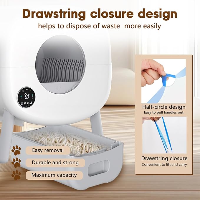 - Drawstring Design: Each cat litter box liners come equipped with a convenient drawstring closure, allowing for quick and easy disposal without mess. The drawstring design minimizes odor release and makes excrement disposal more hygienic while keeping your hands clean. Simply pull, tie, and toss—disposing of cat litter has never been this effortless