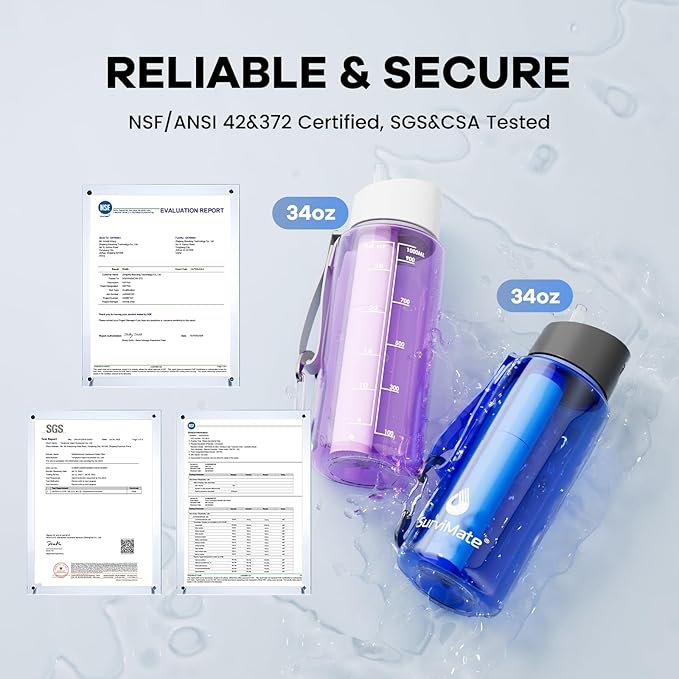 - 【5-Stage Filtration】:The Survimate water filter bottle adopts a composite filter technology, can reduce most contaminants. The filter element uses a coarse filter screen, a 0.01μm hollow fiber UF membrane, a sediment PP membrane, purification beads, and an activated carbon fiber to reduce chlorine, bad odor and intercept heavy metals, sediment, soil, organic matter and other impurities, etc.