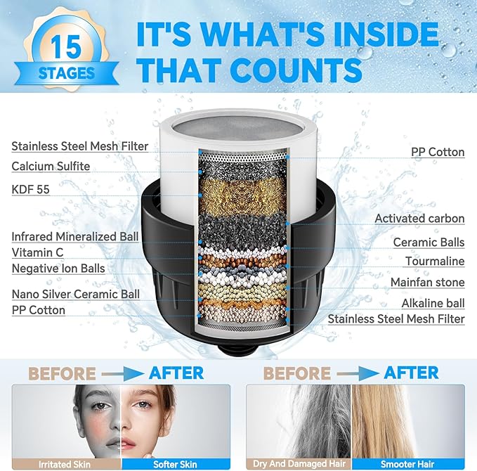 - SOFT WATER MAKE SKIN HAIR HEALTH: Multi-Stage shower head filters effectively filtering harmful substances in water, eliminates odors, reduce skin itching, allergies, dry hair, flaky dandruff, and brittle nails. Improve condition of your skin, hair and nails. Soft water can also protect your shower system, extend lifespan, and reduce the risk of shower head damage and falling off.