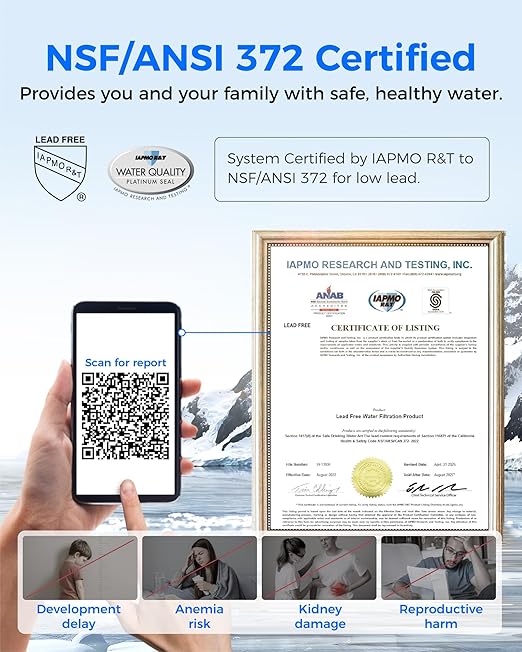 - 𝐂𝐞𝐫𝐭𝐢𝐟𝐢𝐞𝐝 𝐒𝐚𝐟𝐞 𝐑𝐞𝐯𝐞𝐫𝐬𝐞 𝐎𝐬𝐦𝐨𝐬𝐢𝐬 𝐖𝐚𝐭𝐞𝐫 𝐅𝐢𝐥𝐭𝐞𝐫: IAPMO R&T certified to NSF/ANSI 372 standards for lead-free materials, our installation-free RO system offers more than just filtration — it's a promise of cleaner, healthier hydration.