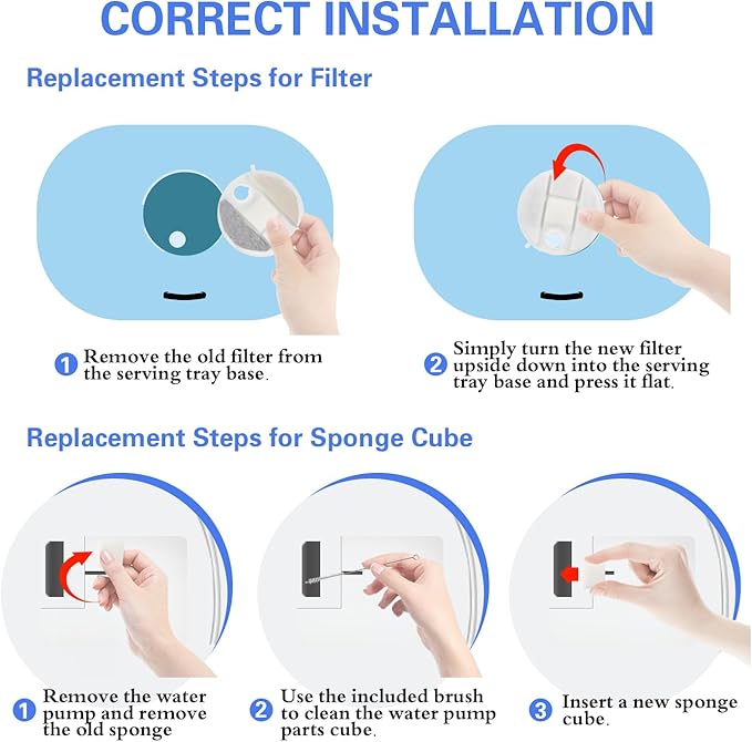 - FOR OPTIMAL USE: Soak the filter for 5 minutes and rinse for 30 seconds before use. To maintain the filtering effect, we recommended replacing the filters every 2 weeks. If you have multiple pets, please clean the fountain and change the filter more often.