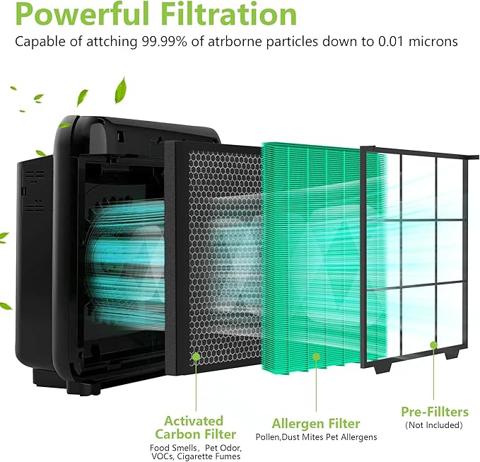 - 【Cost-effective】Included 2 Enhanced True HEPA Activated Carbon Filter,It has a stronger air purification function and is more environmentally friendly, reducing waste.True HEPA is designed with high quality H13 and eco-friendly material construction. The HEPA filter is made of microfiber pleated hundreds of times, which helps adsorb 99.7% of air particles as small as 0.3 microns and filters out unpleasant odors, so you can breathe fresh air freely,