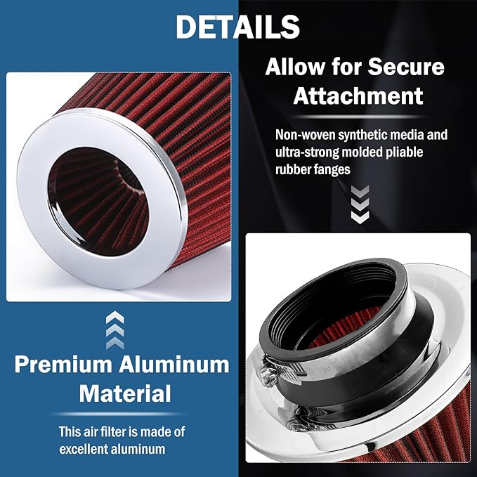 - 【WORLD-CLASS PROTECTION】Safeguard your engine against harmful contaminants with our top-of-the-line filtration technology. We're dedicated to pushing the limits of engine protection, ensuring your vehicle performs at its peak while maintaining its longevity.Upgrade your vehicle's performance, protect your engine, and make an eco-friendly choice with our Universal Clamp-On Air Intake Filter.