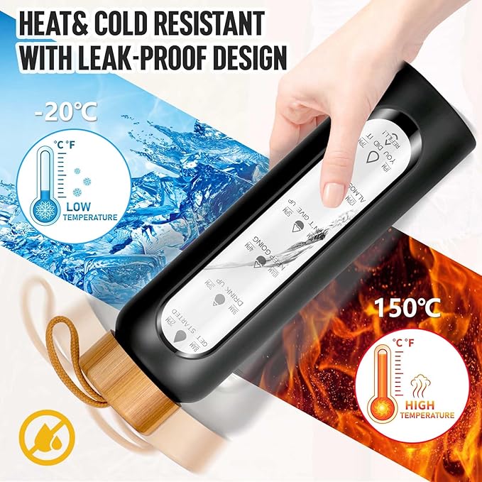 - Your Ultimate Hydration Partner: Our clear glass drinking bottle are made of borosilicate glass, which is dishwasher safe, leak proof, BPA, BPS, PVC, lead, and cadmium free. These durable and aesthetic reusable glass time water bottles will not crack under extreme temperature and pressure