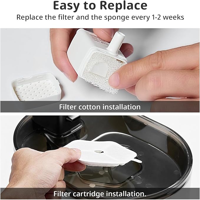 - Regular filter changes: In order to maintain the filtration effect, please replace the filter and sponge once every 2-4 weeks; If you keep more than one pet, the cleaning of the pet fountain and the replacement of the filter need to be increased