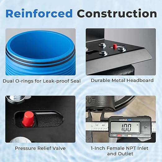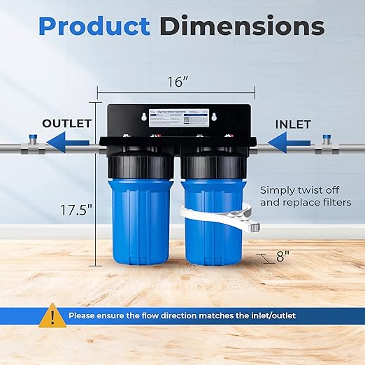 - [Easy Installation and Filter Change] The system comes pre-assembled onto the mounting bracket for a streamlined, DIY installation. A filter wrench is included to make routine filter changes easy and quick. A pressure release valve allows for the release of built-up pressure when changing filters. Refer to our manual and/or YouTube videos to Install this point-of-entry (POE) filtration system at the main water supply to get clean and healthy water for the entire family.