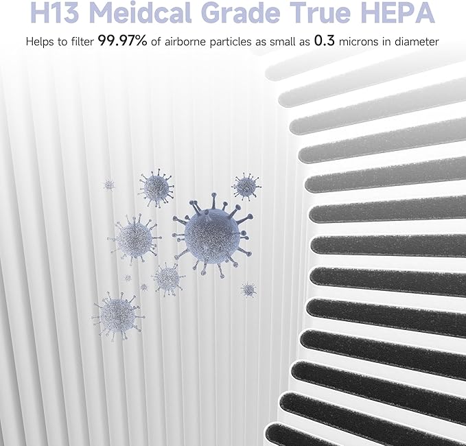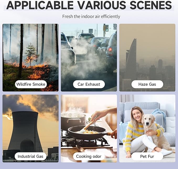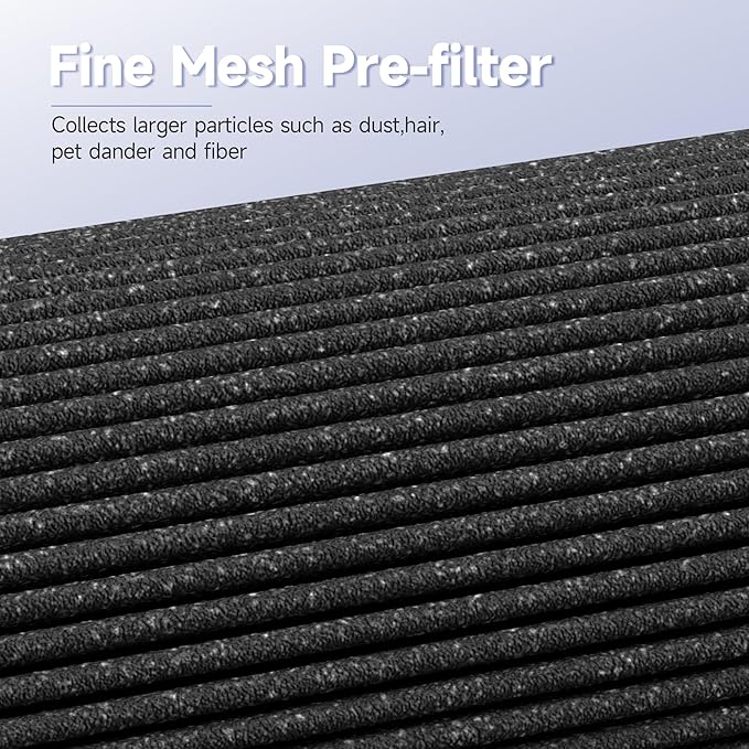 - High Efficiency: Effectively absorb both airborne particles such as dus-t, pet dander, and poll-en, as well as gas-es and odors like smoke and VOCs