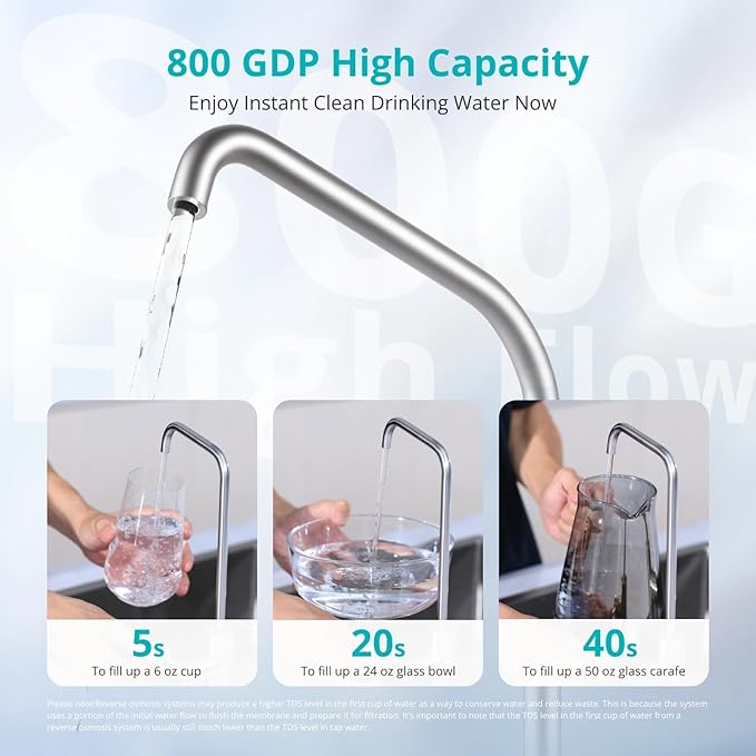 - [High-Capacity 800 GPD Fast Flow] Get water on demand. Our system fills a 7oz cup in just 6 seconds, so you can drink instantly without waiting. The large water flow also makes it convenient for washing fruits and vegetables. Note: Our water filter not compatible with refrigerators or ice makers.