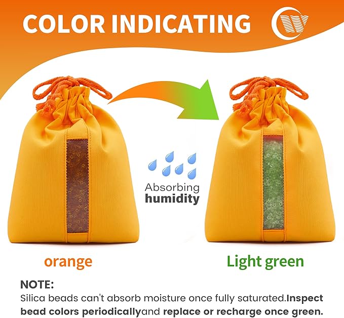 - 【Visible Transparent Window】: The clear window makes it easy to monitor the silica gel's moisture absorption, allowing you to conveniently check the absorption level of the desiccant packs. A color change from orange to light green signifies that the environmental RH is above 50% and that moisture absorption is nearing saturation, indicating the need for reactivation.
