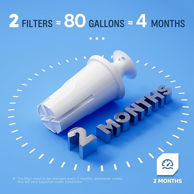 - EXTENDED LIFESPAN: Each filter is designed to handle up to 40 gallons of water under normal conditions, depending on water quality and usage, making it a convenient and efficient choice for your daily hydration needs. Replace it every 2 months, this will vary based on your actual water condition