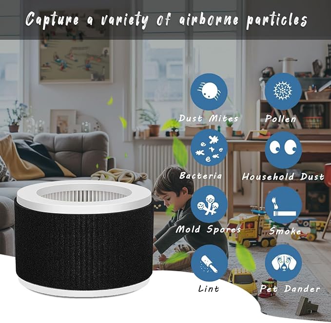 - 3-Stage High-Efficiency Filtration System:Featuring a 3-in-1 H13 True HEPA filter, combined with activated carbon and fine pre-filter layers, it effectively captures dust, pet dander and smoke, providing fresh air for your home or office