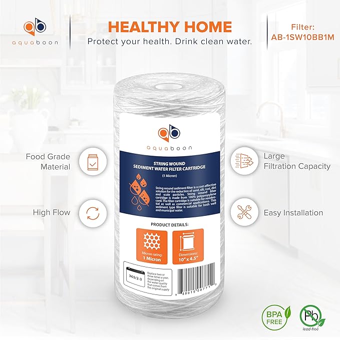 - Precision Filtration, Drop by Drop: Aquaboon’s string wound water filter cartridge ensures well water filter captures even the tiniest particles. With 1 micron accuracy, whole house filter removes dirt, rust, and impurities, leaving water crystal clear.