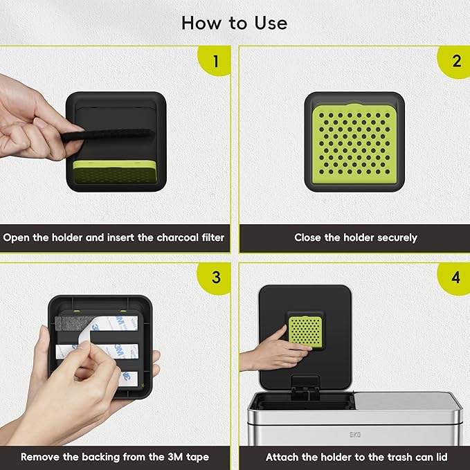 - Odor Elimination Made Easy: Effortlessly attach the EKO deodorizer compartment to your trash can, closet, or any storage area. Insert the activated charcoal filter to effectively absorb and eliminate odors, ensuring your home remains fresh and clean.