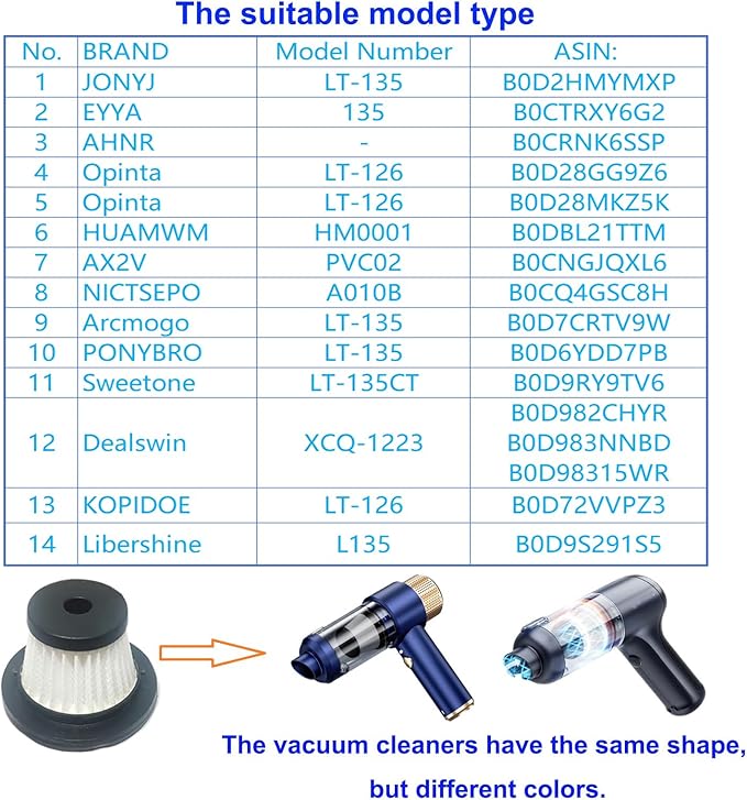 - 👍【Applicable Brands and Models】Filters for EYYA 135 Vacuum , Filters for JONYJ LT-135, Filters for AX2V, Filters for AHNR, Filters for Opinta LT-126, Filters for Sweetone, Filters for HUAMWM, NICTSEPO, Arcmogo, PONYBRO, Dealswin, KOPIDOE car vacuum etc.