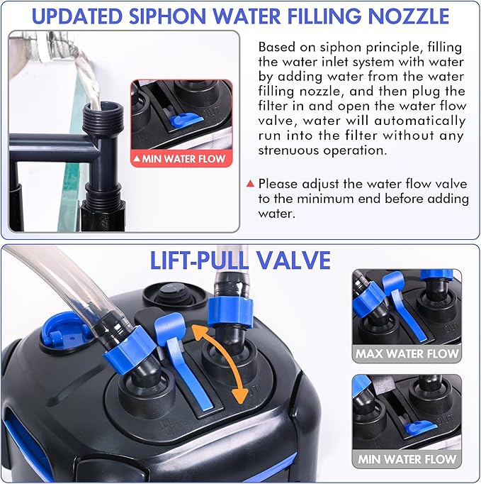 - One Step To Make The Filter Running: Updated Design - Siphon Water Filling Nozzle, only one step that filling the water inlet system with water by adding water from the the water filling nozzle, water will automatically run into the filter after plugging the filter in and opening the water flow valve without any strenuous operation.