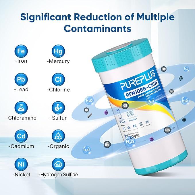 PUREPLUS 5 Micron 10" x 4.5" Whole House KDF/GAC Water Filter, Heavy Metal Removal Replacement Water Filter, RFN10BB-CKDF, 1PACK