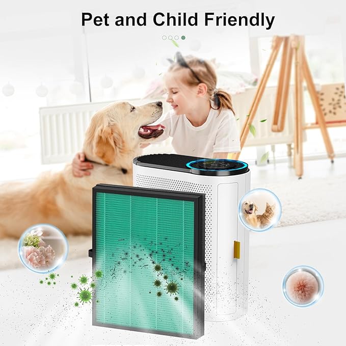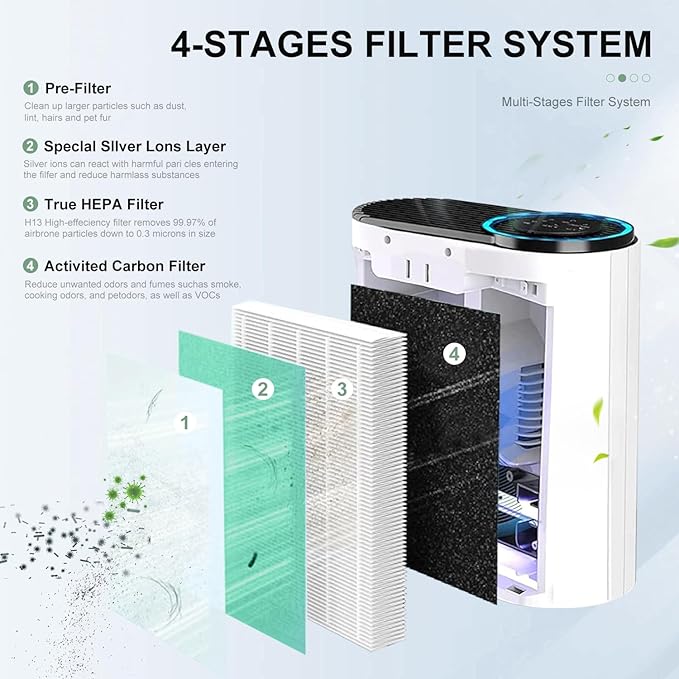 - 4-LAYER FILTRATION SYSTEM: Our air purifiers filter MK-04 is designed with a 4-in-1 High-Efficiency System. Pre-Filter, H13 True HEPA Filter, Special Coating Layer for pet, and Activated Carbon Filter. Attach to 99.97% of airborne particles like pollen