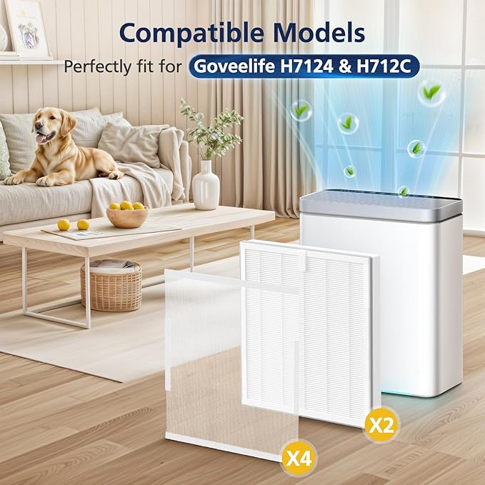 H7124 Replacement Filters for GoveeLife H7124 & H712C Smart Air Purifier, 3-IN-1 H7124 Hepa Filters, Replace Part H7124-RF | H712C-RF, 2 Hepa Filters + 4 Washable Nylon Pre-Filters