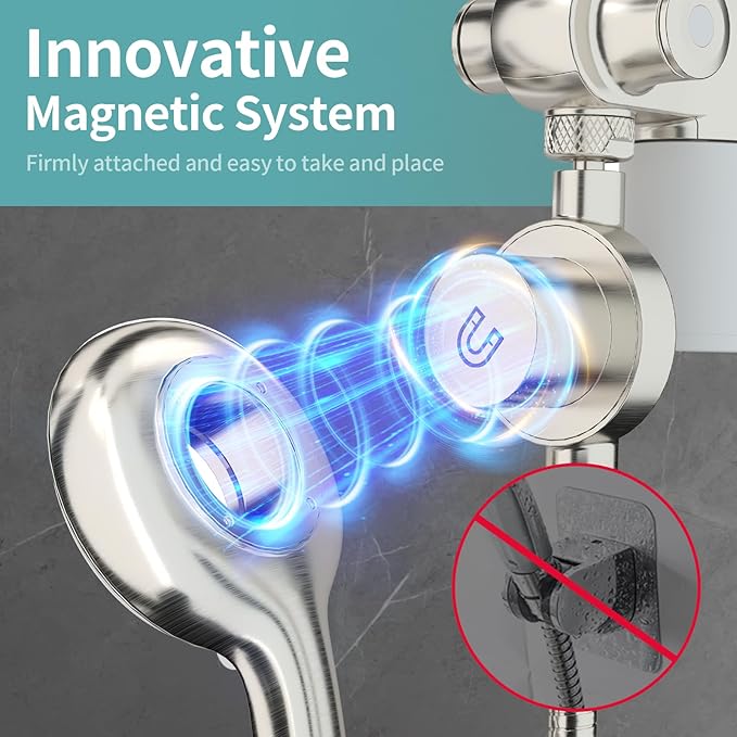 - 【Unique Magnetic Base】Our magnetic filtered shower head with handheld combo has a unique magnetic docking base. Its powerful magnetism can firmly attach the handheld shower head to the base without an additional shower bracket. Due to its magnetic attraction function, you can easily place and take the handheld shower head even with your eyes closed. In addition, the base can be swivelled 360°, making it easy to position the shower head at the suitable angle.