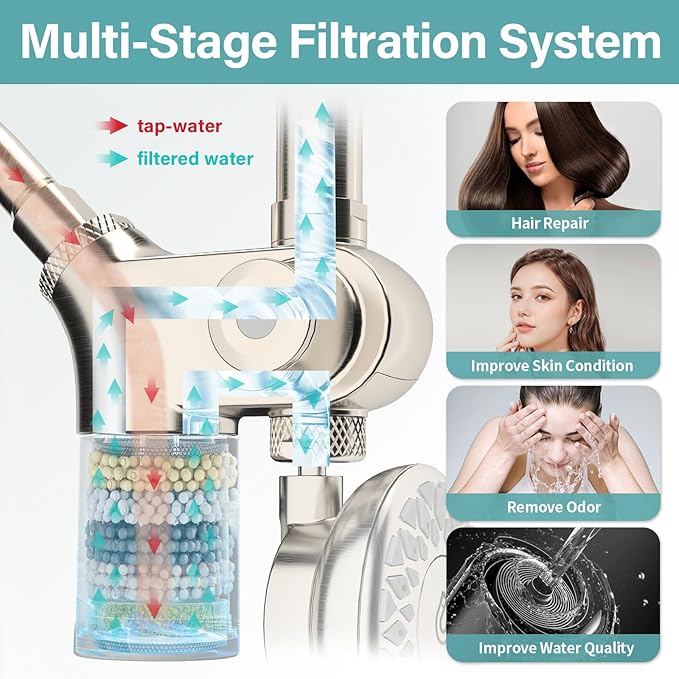- 【Integration Replaceable Filter Cartridge】The hard water filter showerhead combo are designed with integrated filter cartridge for both rainfall shower head and the handheld shower head filtration. You can choose whether you need to install it or not. The filter cartridge are made of various filtration materials (VC Balls, Maifan Stone, Calcium Sulfite, etc.), which can effectively remove chlorine, heavy metals and harmful substances from the water, improving the quality of water.