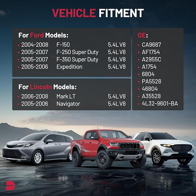 - 【COMPATIBILITY】Compatible with Ford Expedition 2005-2006 V8 5.4L, For F-150 2004-2008 V8 5.4L, For F-250 Super Duty 2005-2007 V8 5.4L, For F-350 Super Duty 2005-2007 V8 5.4L; Compatible with Lincoln Mark LT 2006-2008 V8 5.4L, Navigator 2005-2006 V8 5.4L.