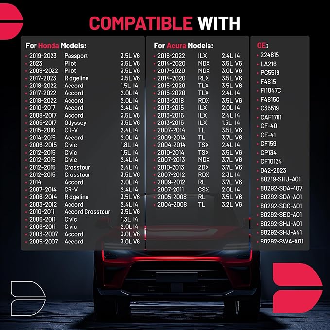 - 【Fitment】Compatible with Honda Models: 2019-2023 Passport, 2009-2023 Pilot, 2017-2023 & 2006-2014 Ridgeline, 2003-2022 Accord, 2005-2017 Odyssey, 2015-2016 CR-V, 2006-2015 Civic, 2012-2015 Crosstour, 2007-2014 CR-V, 2010-2011 Accord Crosstour; Compatible with Acura Models: 2013-2022 ILX, 2014-2020 MDX, 2013-2020 RLX, 2007-2018 RDX, 2015-2020 TLX, 2004-2014 TL, 2010-2014 TSX, 2005-2012 RL, 2007-2013 MDX, 2010-2013 ZDX, 2007-2011 CSX