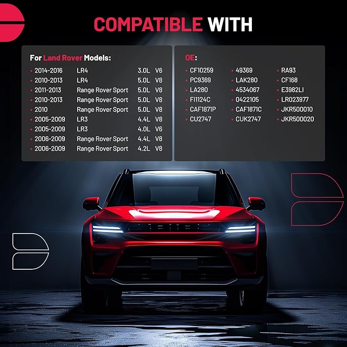 - 【Fitment Vehicles】Compatible with Land Rover Models: 2014-2016 LR4 3.0L V6, 2010-2013 LR4 5.0L V8, 2011-2013 Range Rover Sport 5.0L V8, 2010-2013 Range Rover Sport 5.0L V8, 2010 Range Rover Sport 5.0L V8, 2005-2009 LR3 4.4L V8, 2005-2009 LR3 4.0L V6, 2006-2009 Range Rover Sport 4.4L V8, 2006-2009 Range Rover Sport 4.2L V8