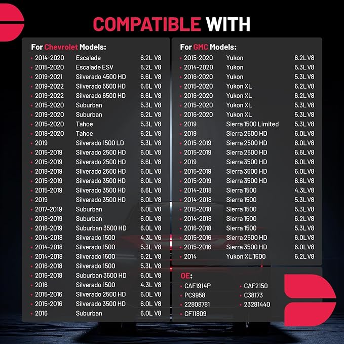 - 【Replaces Part】 CAF1914P, CAF2150, PC9958, C38173, 22808781, 23281440, CF11809. Compatible with Cadillac Models: 2014-2020 Escalade 6.2L V8, 2015-2020 Escalade ESV 6.2L V8