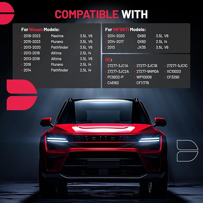 - 【Compatible Replacement】Compatible with Nissan Models: 2016-2023 Maxima 3.5L V6/2015-2023 Murano 3.5L V6/2013-2020 Pathfinder 3.5L V6/2013-2018 Altima 2.5L l4/2013-2018 Altima 3.5L V6, 2016 Murano 2.5L l4/2014 Pathfinder 2.5L l4, Compatible with INFINITI Models: 2013 JX35 3.5L V6 ,2014-2020 QX60 3.5L V6, 2014-2017 QX60 2.5L l4