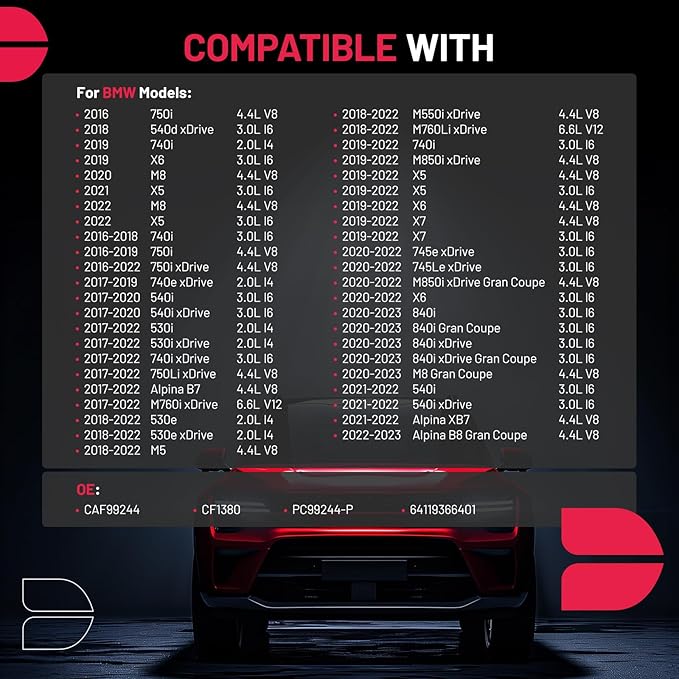 - 【Replaces Part】 CAF99244, CF1380, PC99244-P, 64119366401. Compatible with BMW Models: 2022-2023 Alpina B8 Gran Coupe, 2021-2022 Alpina XB7, 2018-2022 M5/ M550i xDrive/ M760Li xDrive, 2017-2022 M760i xDrive, 2020 & 2022 M8, 2020-2023 M8 Gran Coupe, 2019-2022 M850i xDrive/ X5/ X6/ X7, 2020-2022 M850i xDrive Gran Coupe