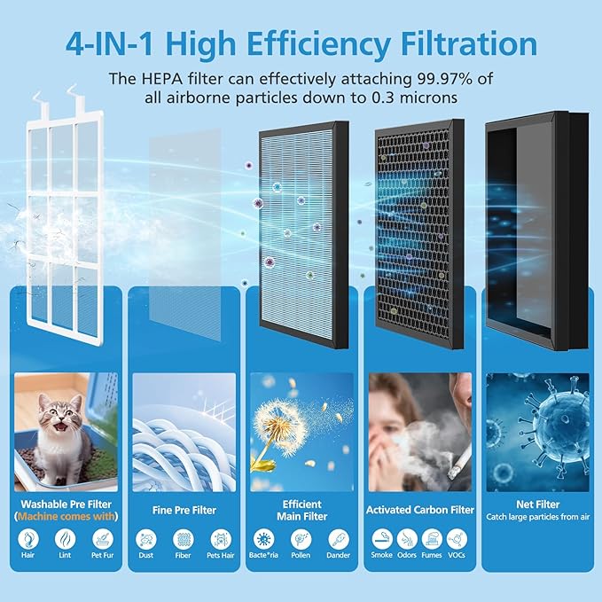 - The AP303/AP304 air purifier replacement filter features a double-sided air inlet design and an efficient 4-stage filtration system. This advanced system combines a pre-filter, HEPA filter, activated carbon filter, and a fine mesh filter, working together to capture airborne particles and neutralize odors in your living space. Enjoy cleaner, fresher air and a healthier home environment every day