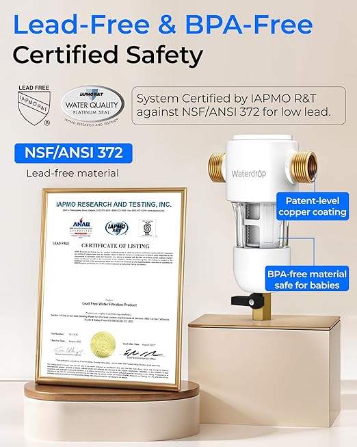 - 【NSF/ANSI Certified Safety】The WD-PF01DB sediment filter meets NSF/ANSI 372 standards for lead-free materials. Its BPA-free housing ensures safety for mothers and babies. Additionally, the high-quality copper head, coated with a patented blue crystal nano-layer, is not only durable but also free from heavy metal leaching, guaranteeing the safety of your water.