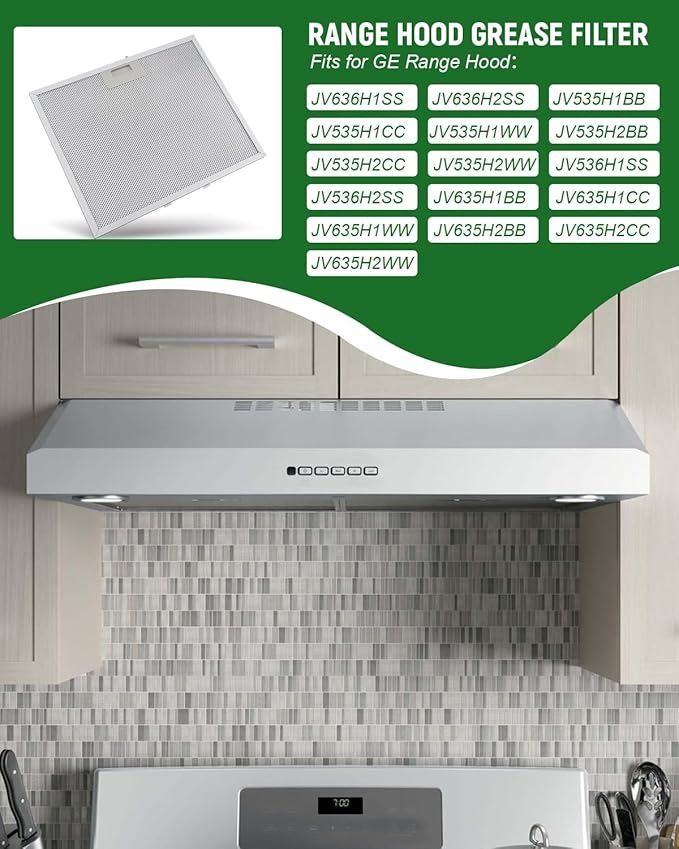 - Multiple Models Compatible: Our range hood grease filter fits for GE range hood JV636H1SS, JV636H2SS, JV535H1BB, JV535H1CC, JV535H1WW, JV535H2BB, JV535H2CC, JV535H2WW, JV536H1SS, JV536H2SS, JV635H1BB, JV635H1CC, JV635H1WW, JV635H2BB, JV635H2CC, JV635H2WW, replace WB02X11011