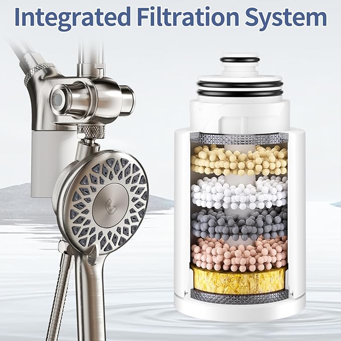- 【Integrated Filtered System】The universal detachable 2 in 1 shower head contains VC Balls, Maifanite, Magnetic Balls, Calcium Sulfite and KDF Copper Powder to effectively filter out chlorine, heavy metals and other contaminants from water. Enjoy the shower with the high pressure water softener shower head while improving the condition of your skin and scalp. Replace the cartridge every 3 to 6 months depending on water quality and frequency of use.