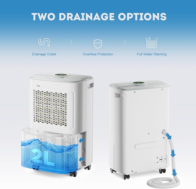 - Manual & Continuous Drain:Easily empty with the included 2L water tank when it is full, the dehumidifier will shut off automatically when the bucket is full and switch on again after the bucket is emptied. You also have the option of continuous drainage by inserting a 6.56ft/2m drainage hose